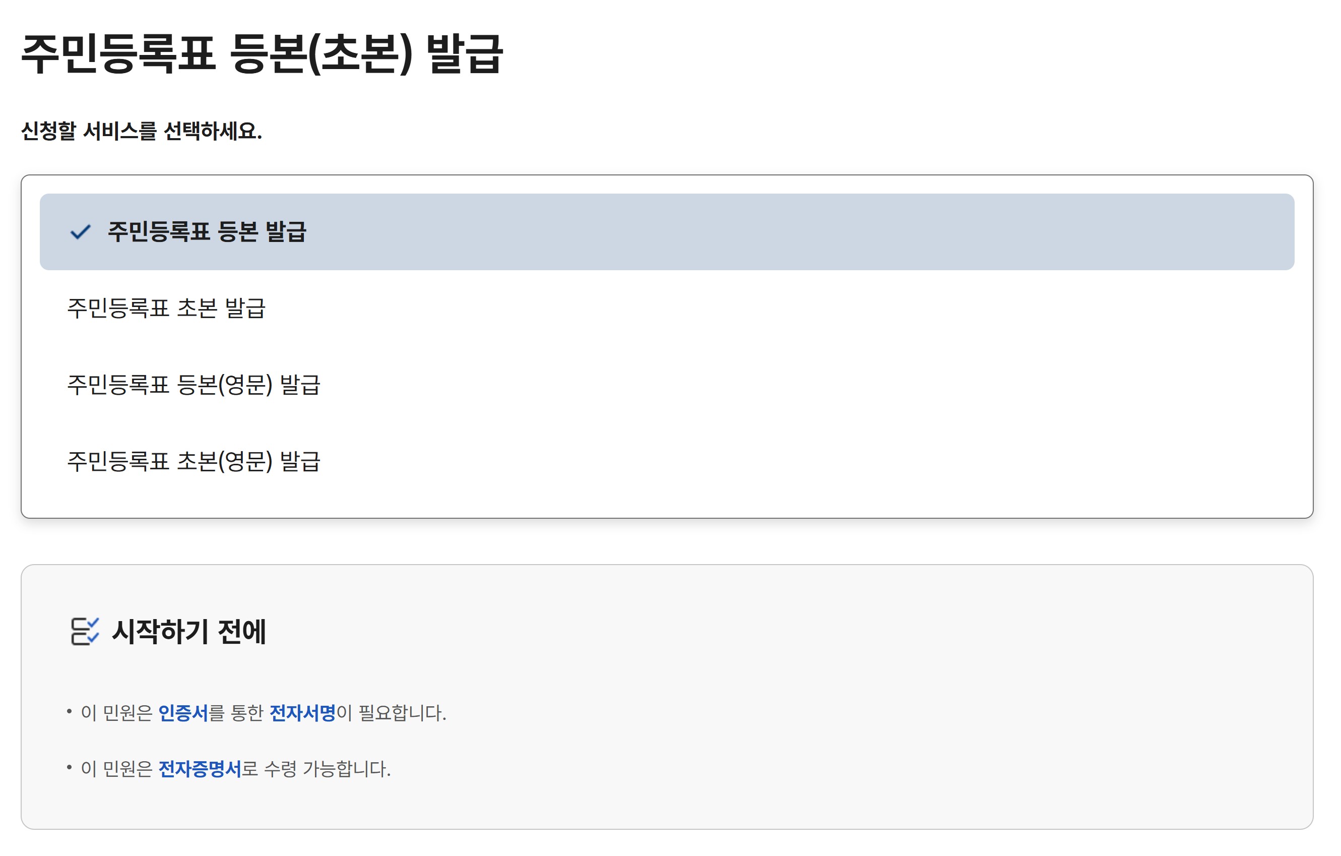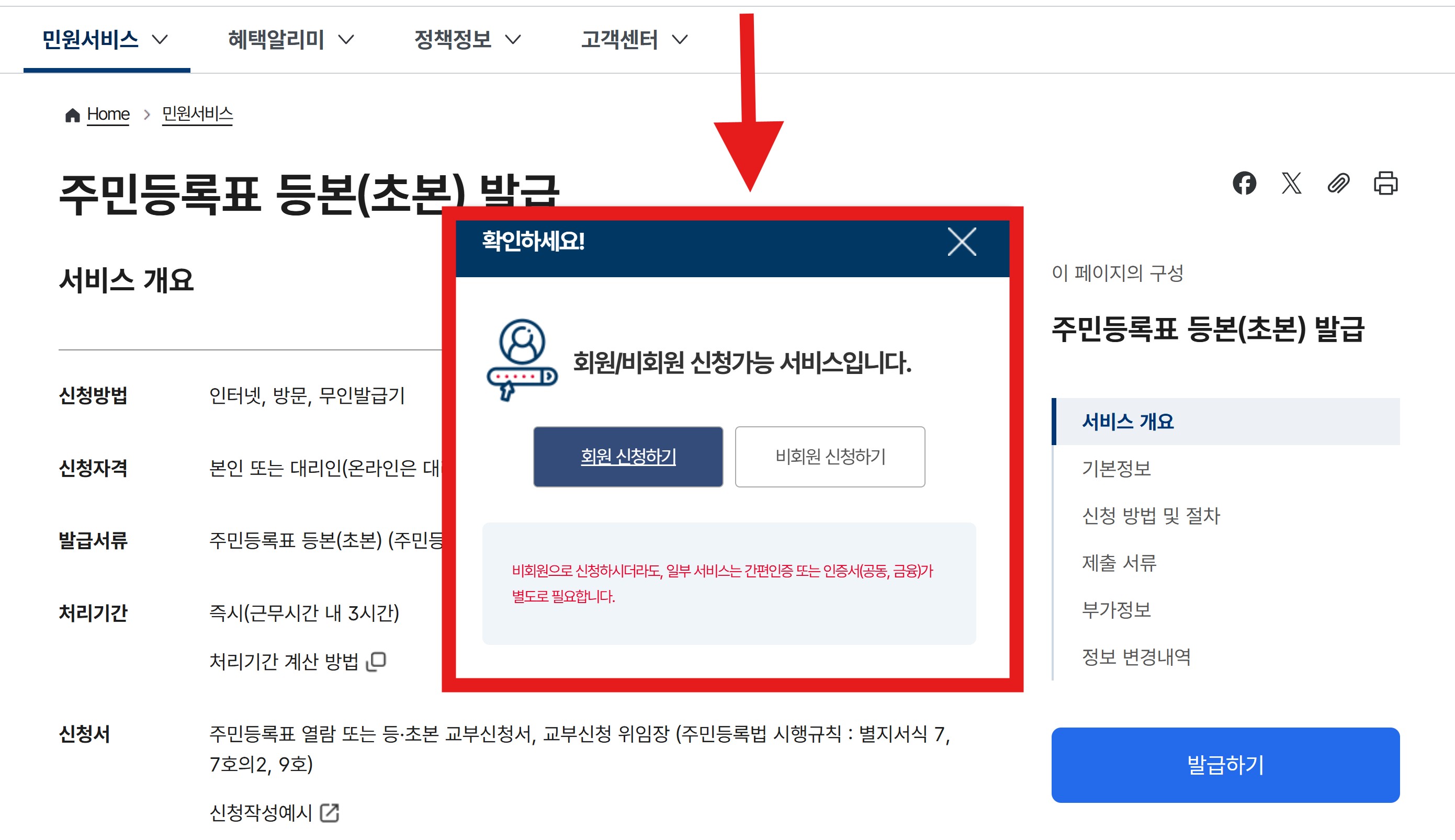발급 페이지에 들어가면 서비스 개요, 신청방법, 발급서류 등의 정보가 나타납니다.