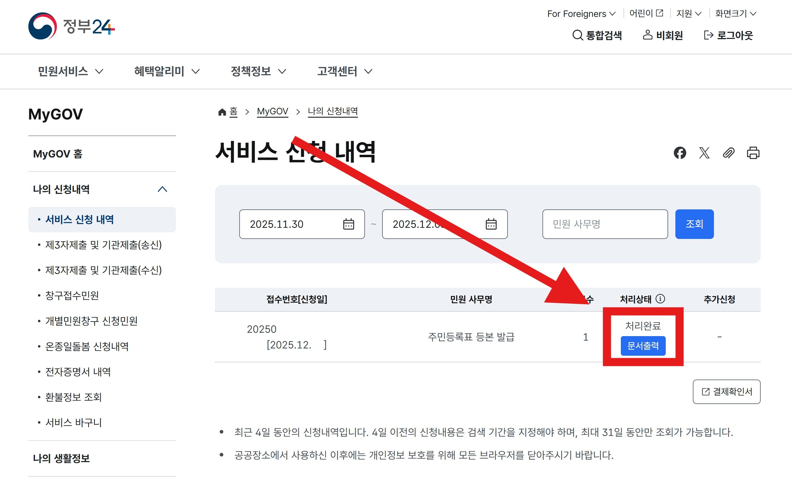 ✔ 9. MyGOV → 서비스 신청 내역 → 문서출력