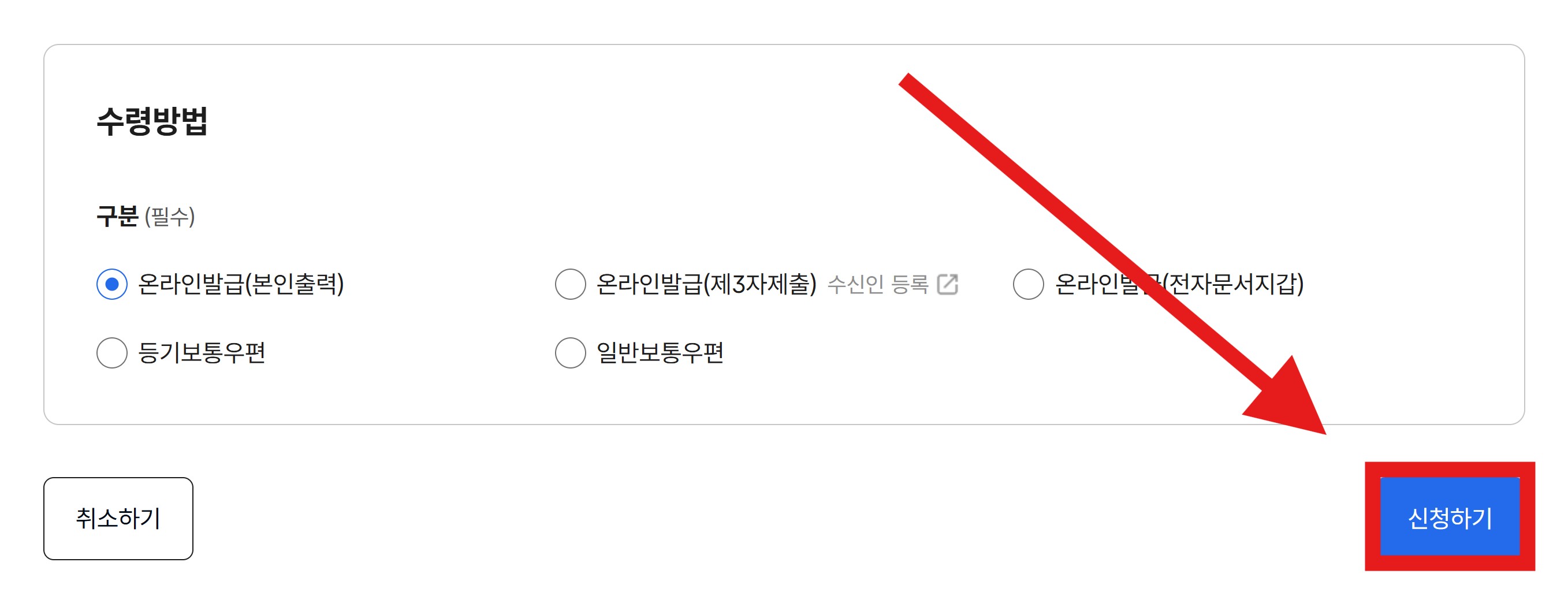프린터가 있다면 온라인발급(본인 출력)을 선택합니다.
