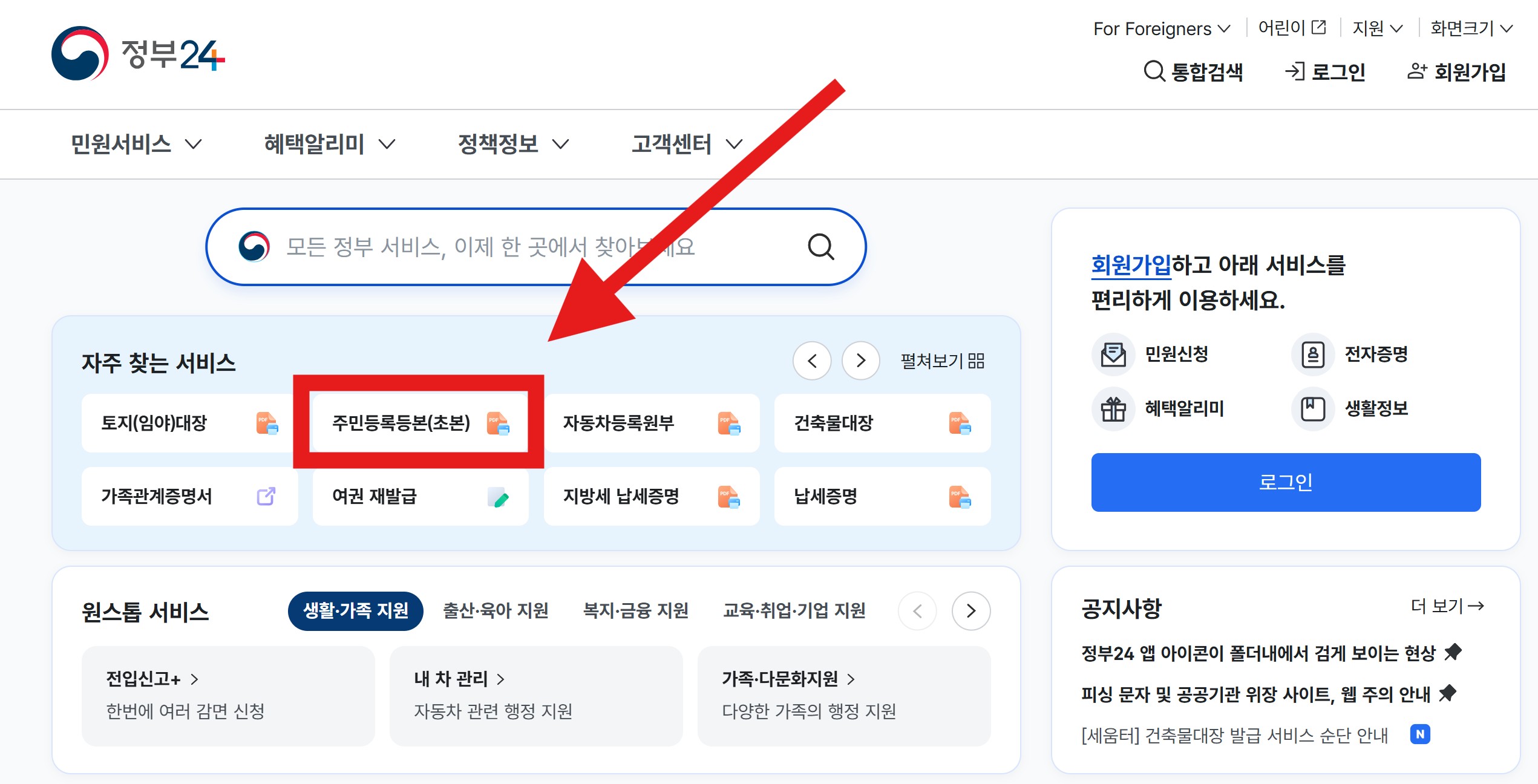 정부24 첫 화면에는 가장 많이 찾는 서비스들이 크게 정리되어 있습니다.